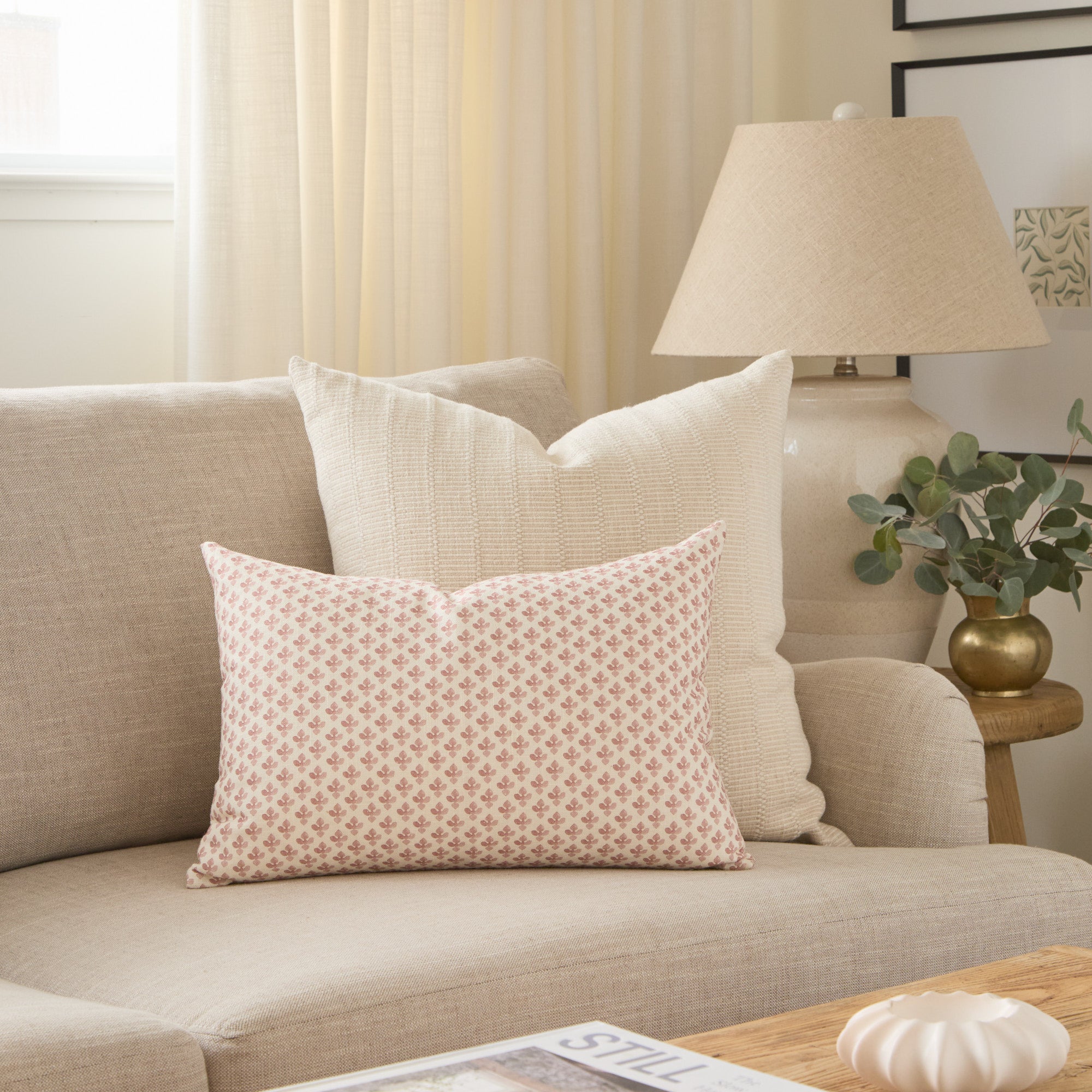 Lumbar pillows & drapery fabrics that showcase a delicate petal block print in four beautiful colours.