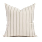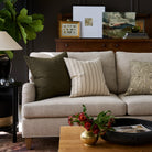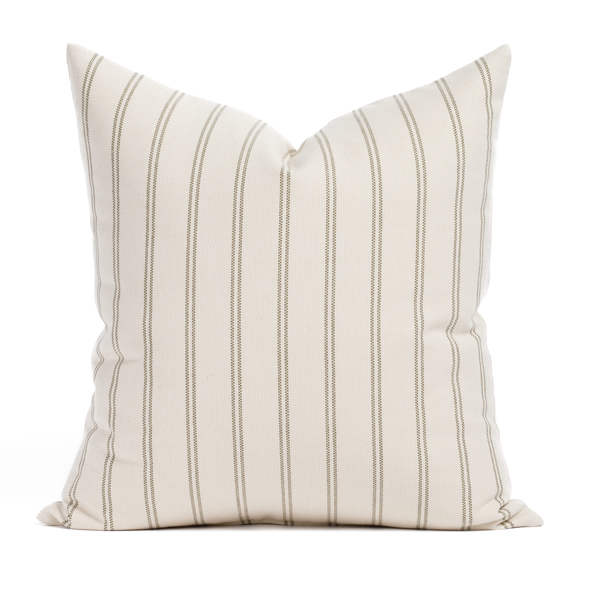 This moss green and oatmeal striped pillow showcases a simple ticking stripe with subtle vintage charm. It’s an easy-to-pair piece with a timeless and versatile look.