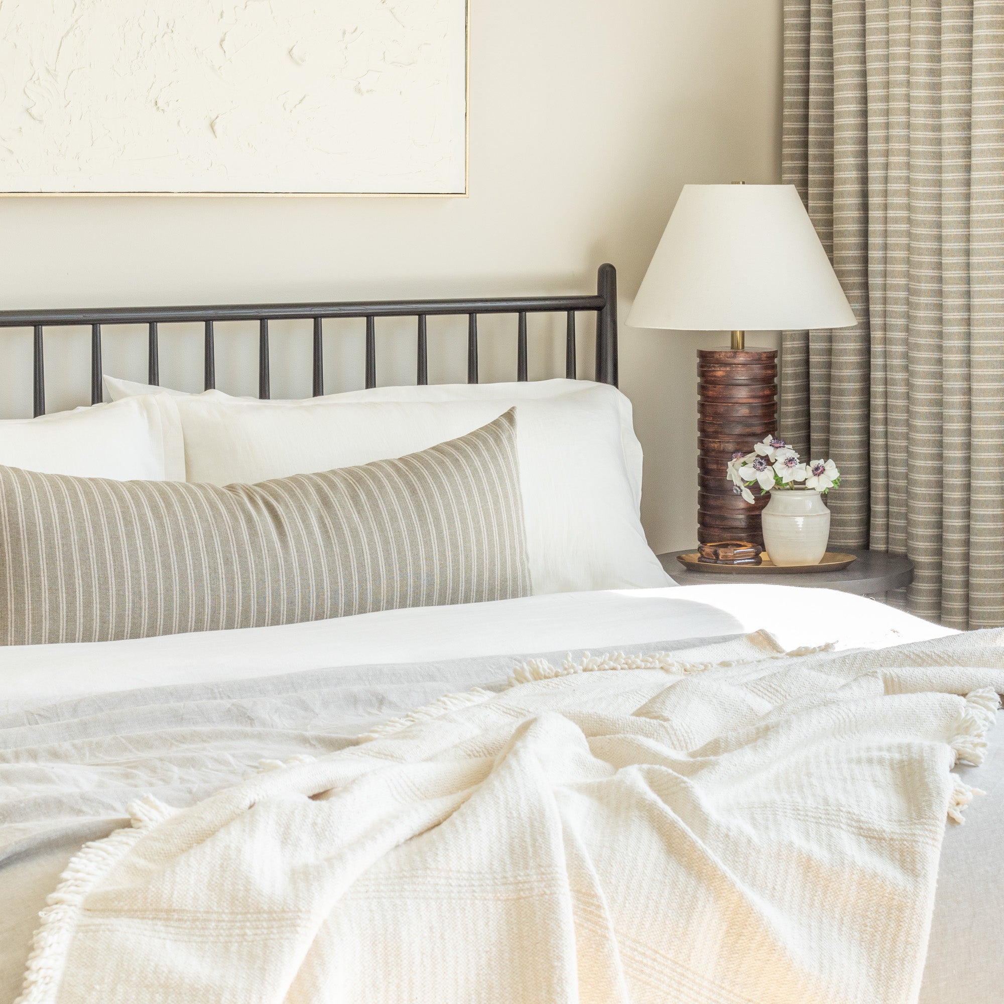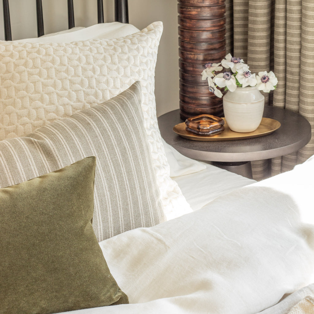 This casual striped bed bolster pillow in a a dusty, sage-green and oatmeal colour palette is an instant classic. With a luxe-meets-earthy aesthetic and organic texture, this highly versatile and beautiful piece effortlessly delivers a coveted Belgian farmhouse style.