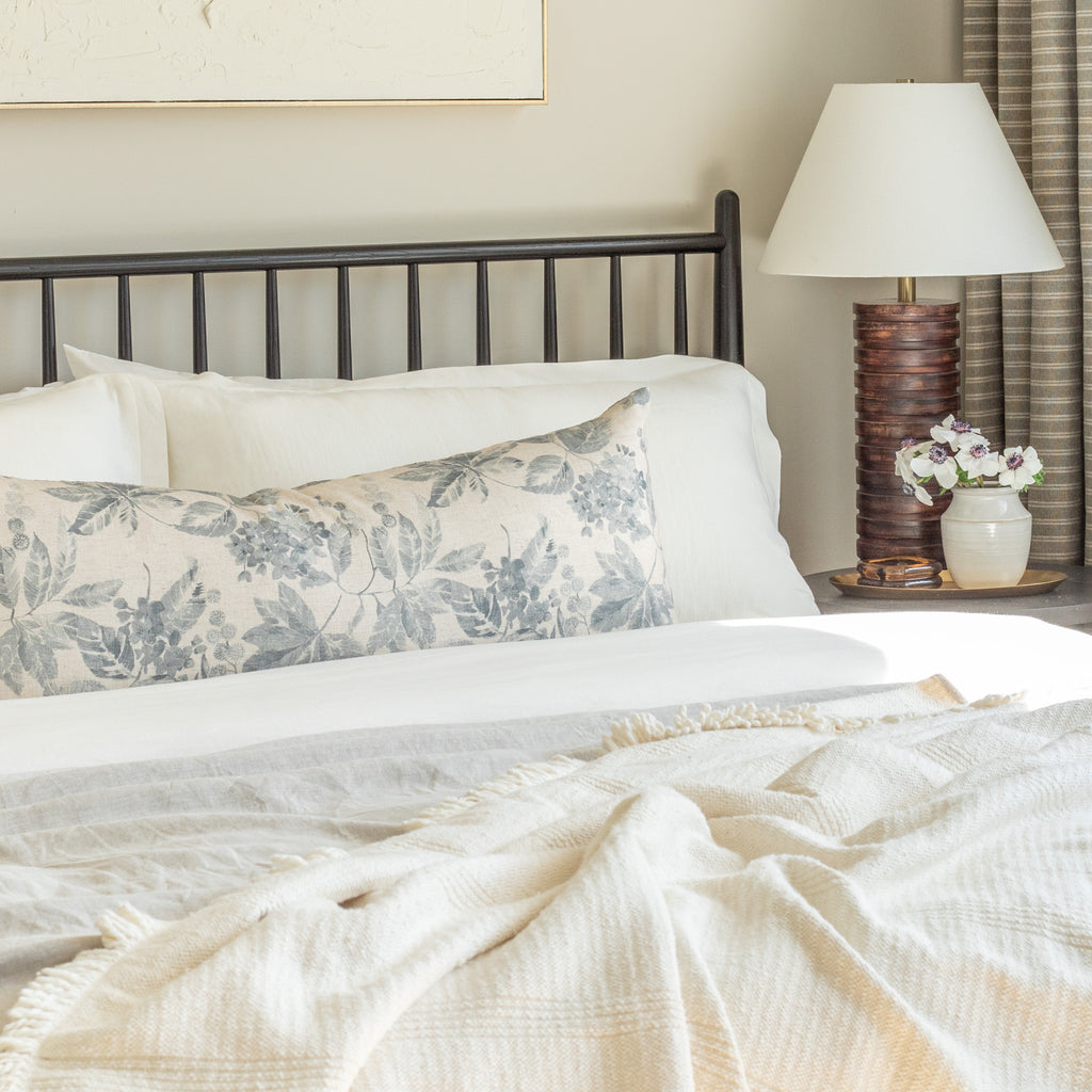 Add effortless elegance to your home with this enchanting floral bed bolster pillow. In a palette of calming indigo blue and oatmeal this beauty features a captivating pattern of botanical wonders from lush leaves to delicate hydrangea blooms. It's both eye-catching yet calming, and is sure to offer layers of character and old-world charm.