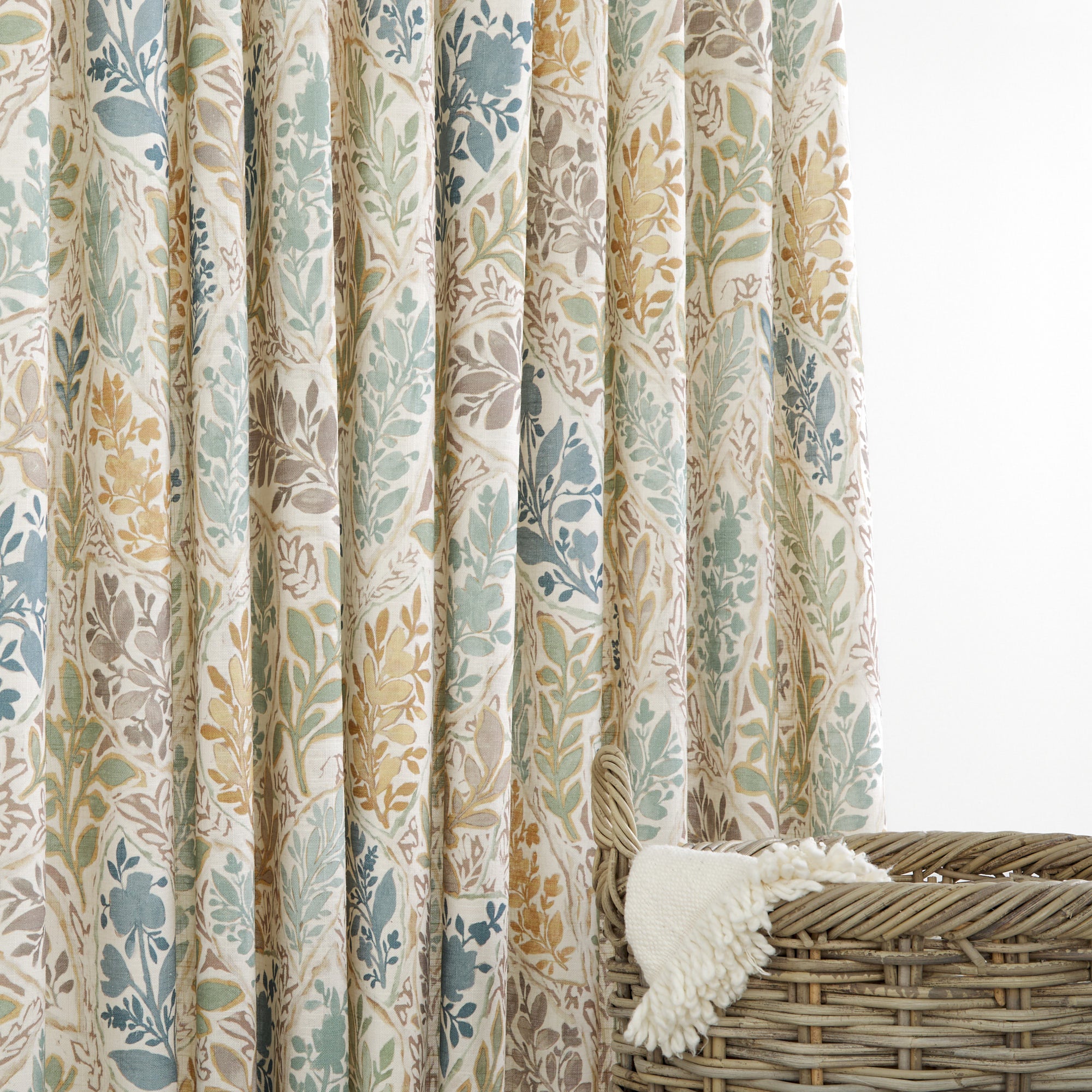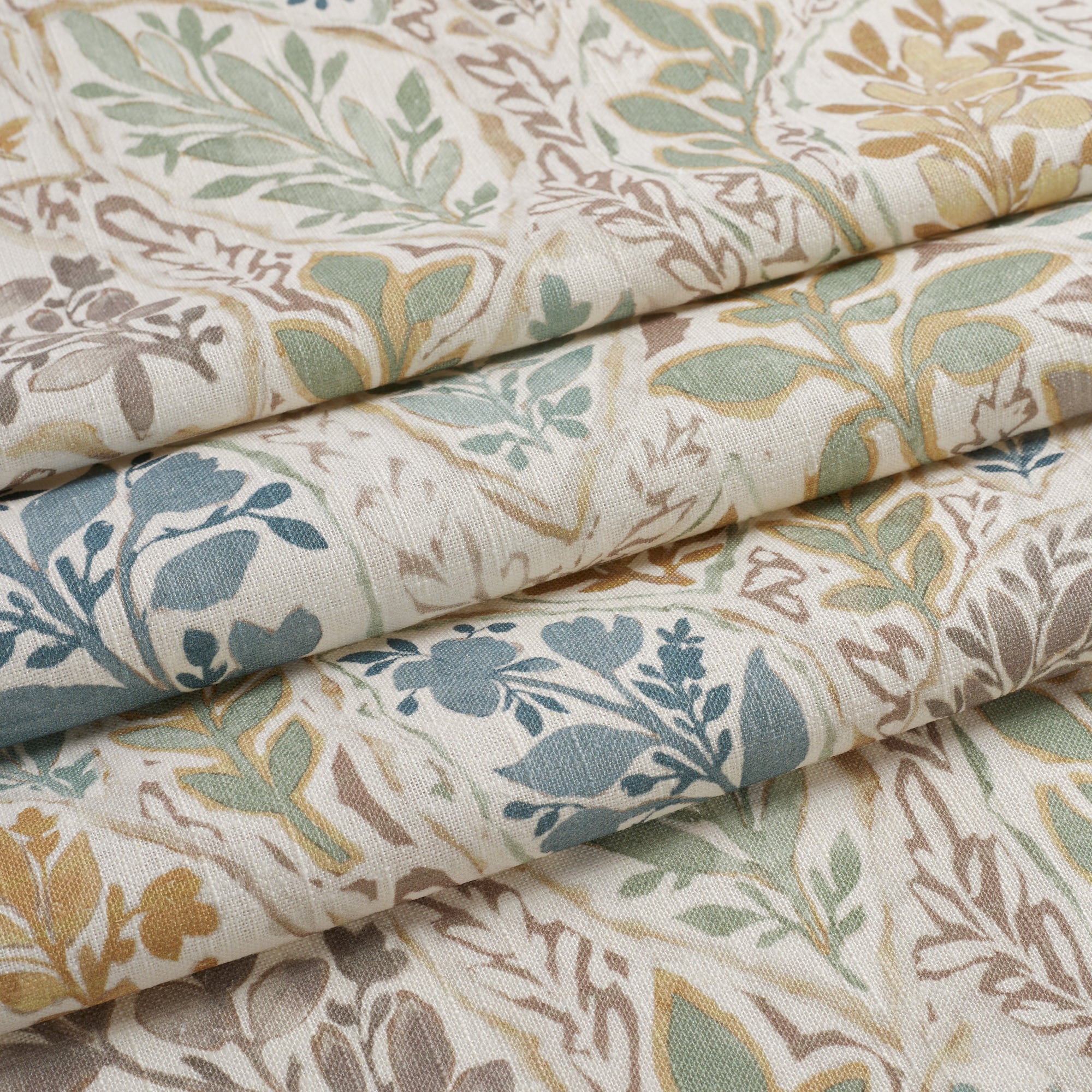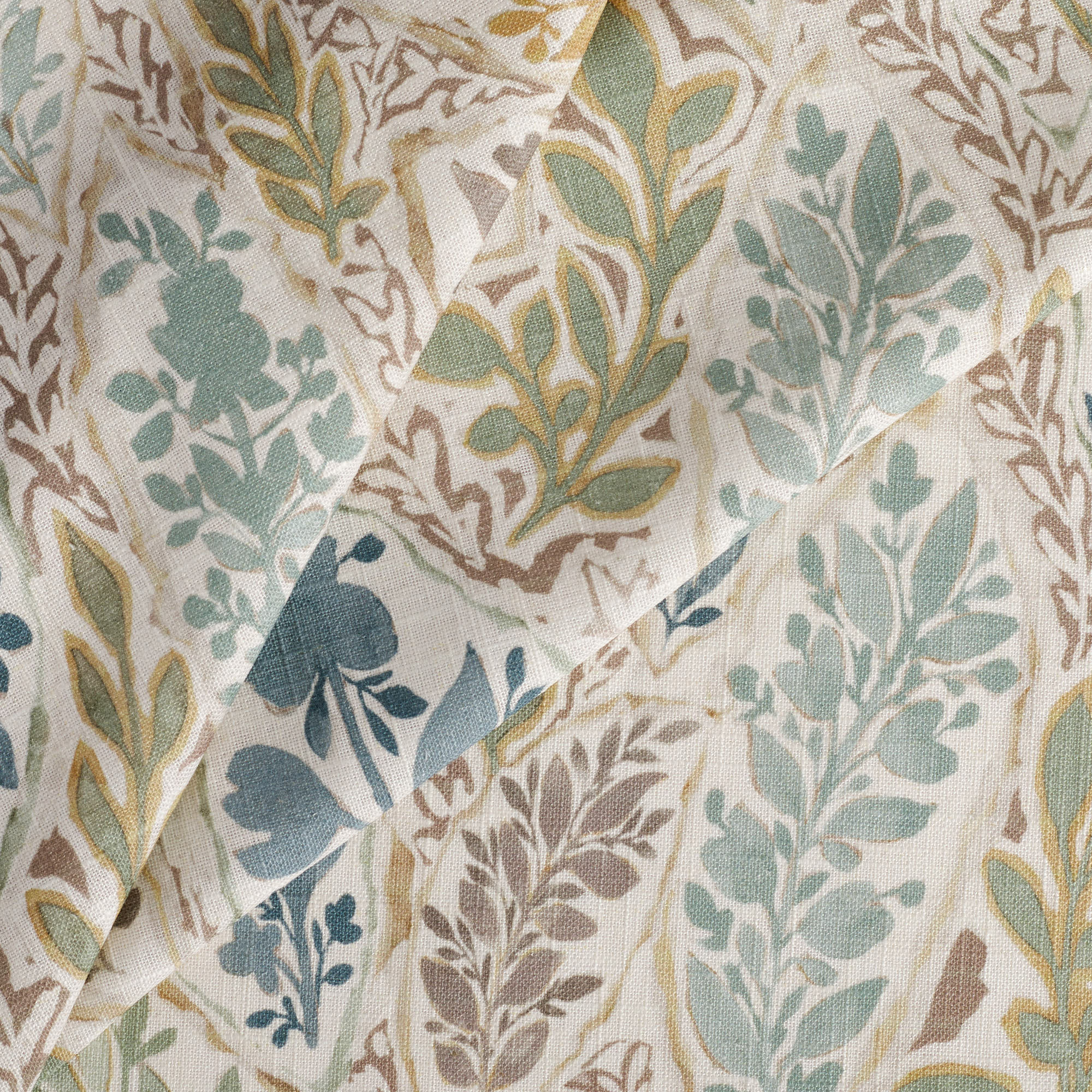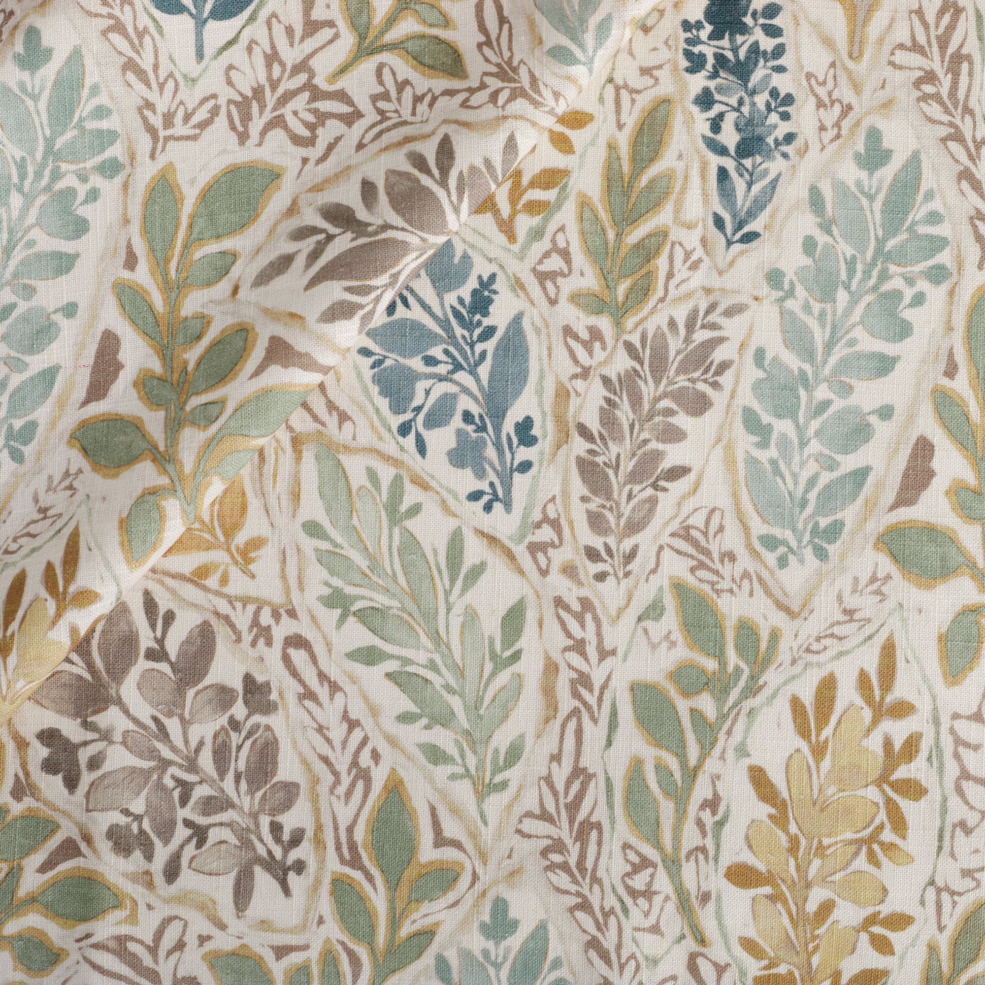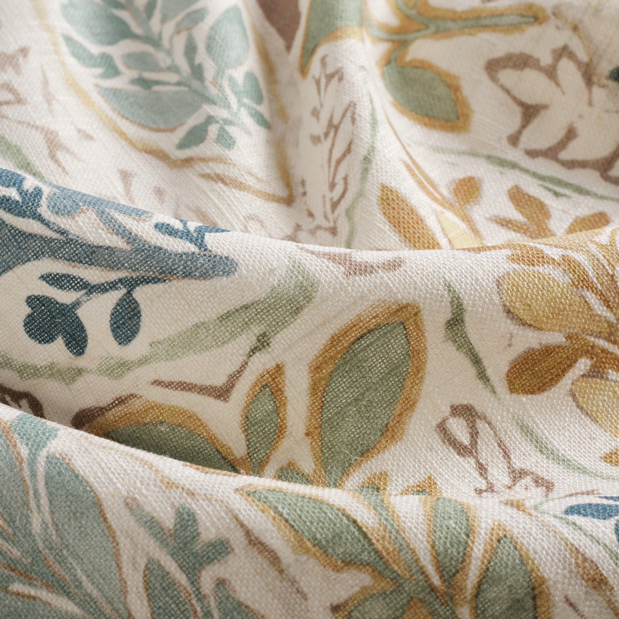 This multipurpose block print style fabric features a loose floral vine pattern on a faded tan, woven ground cloth. With whimsical bird line drawings scattered throughout, the combination of nutmeg brown, aquamarine and French blue come together to create a warm and organic material that will allow you to embrace colour in an effortless and livable way.
