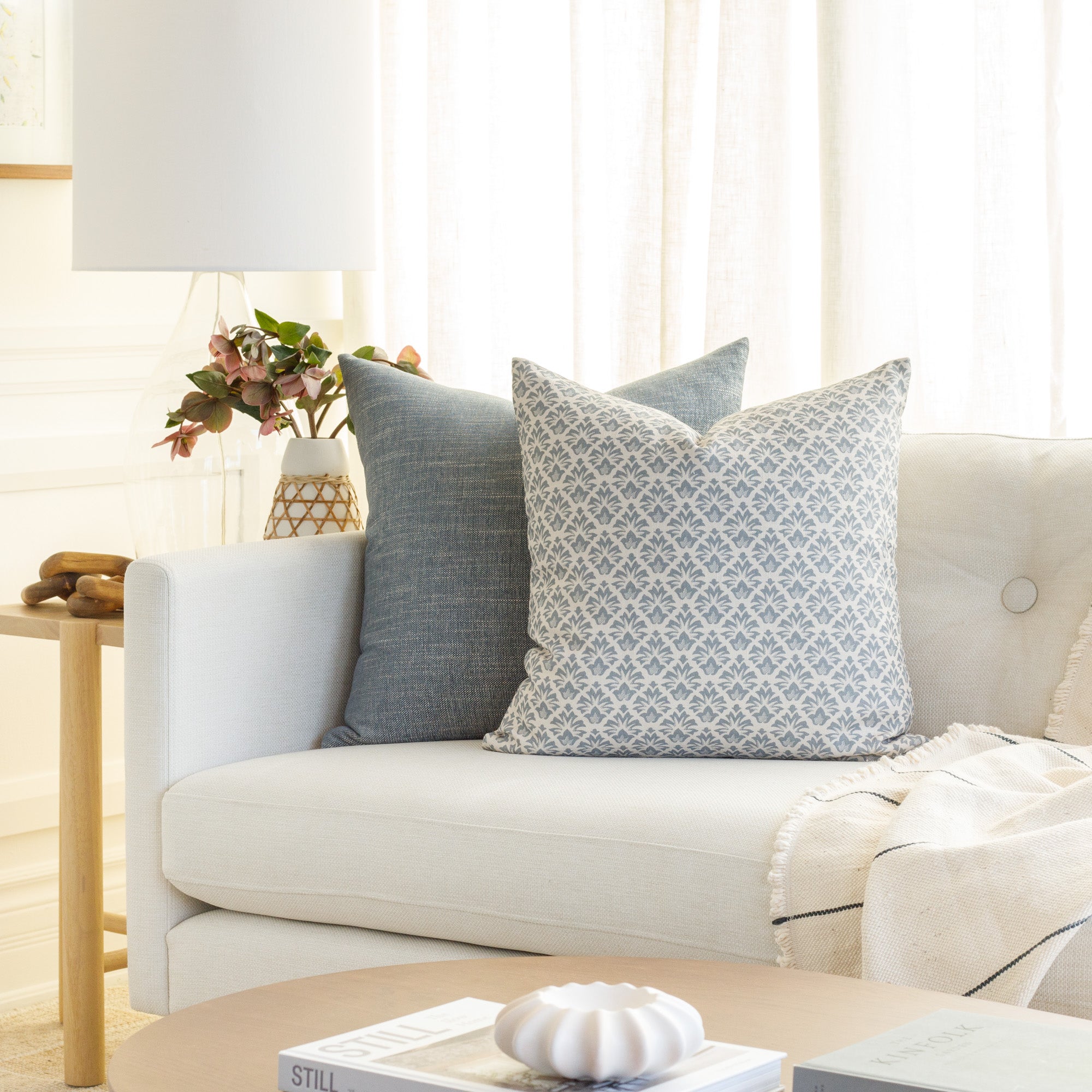 The soft white and light blue floral block print gives this pillow a touch of handcrafted charm.