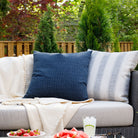 This navy indoor/outdoor pillow showcases a sophisticated tone-on-tone texture with a subtle abstract geometric design.
