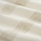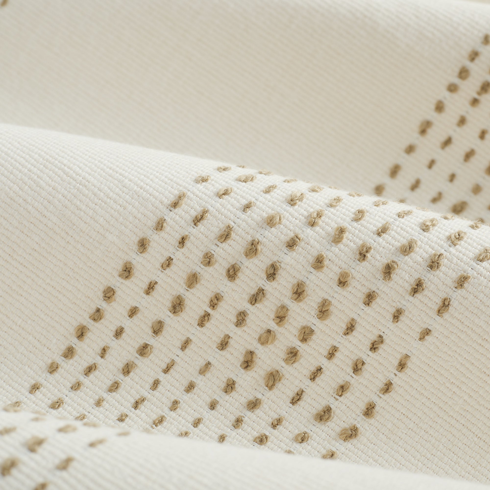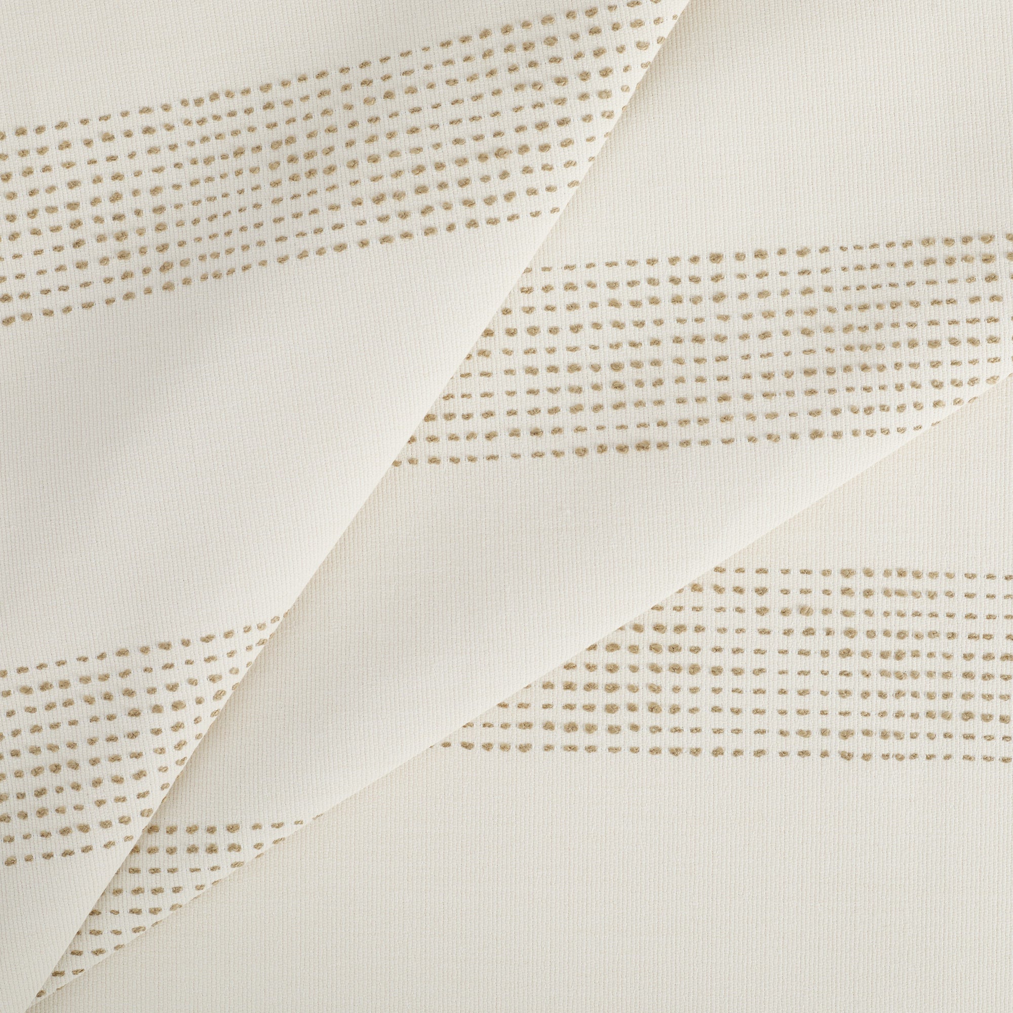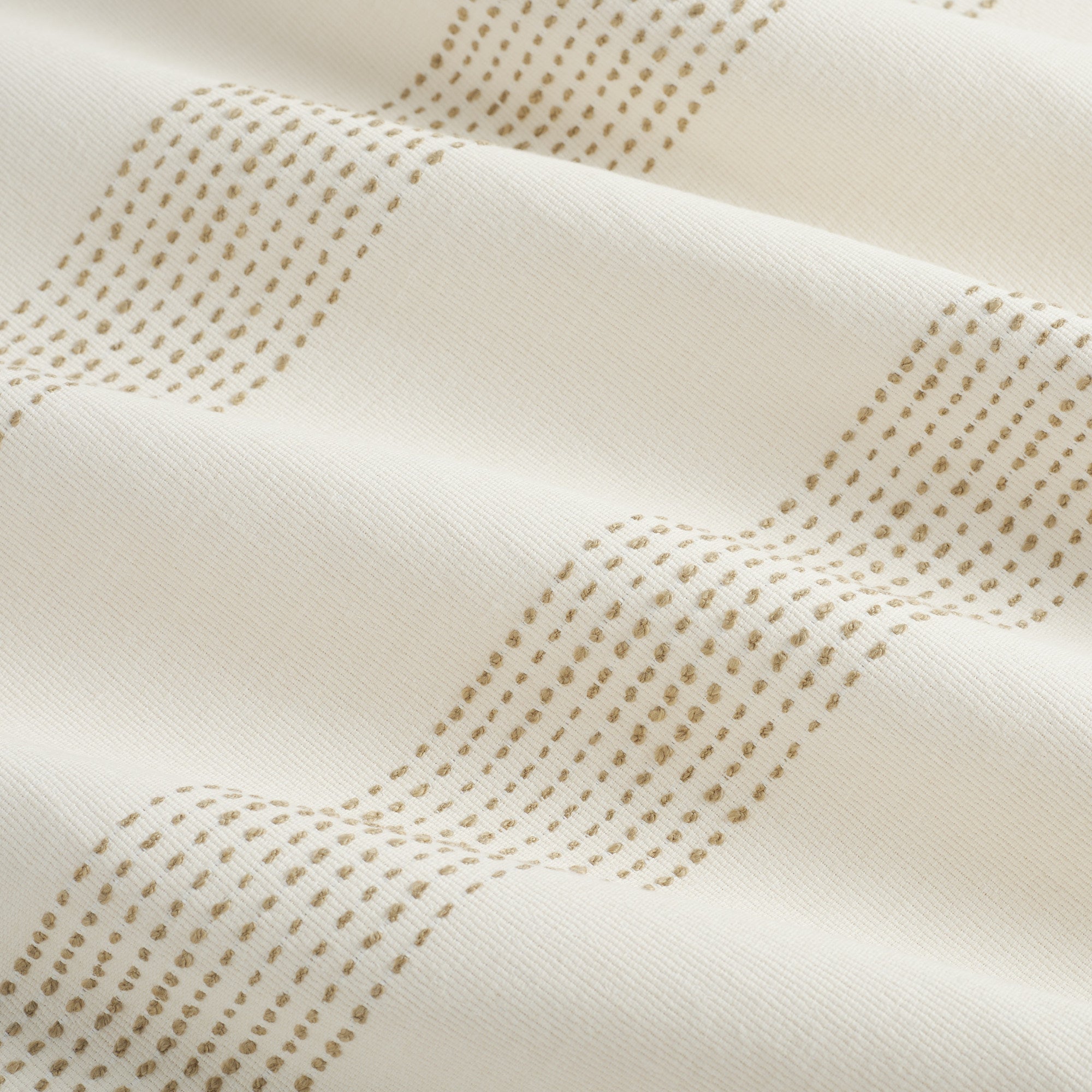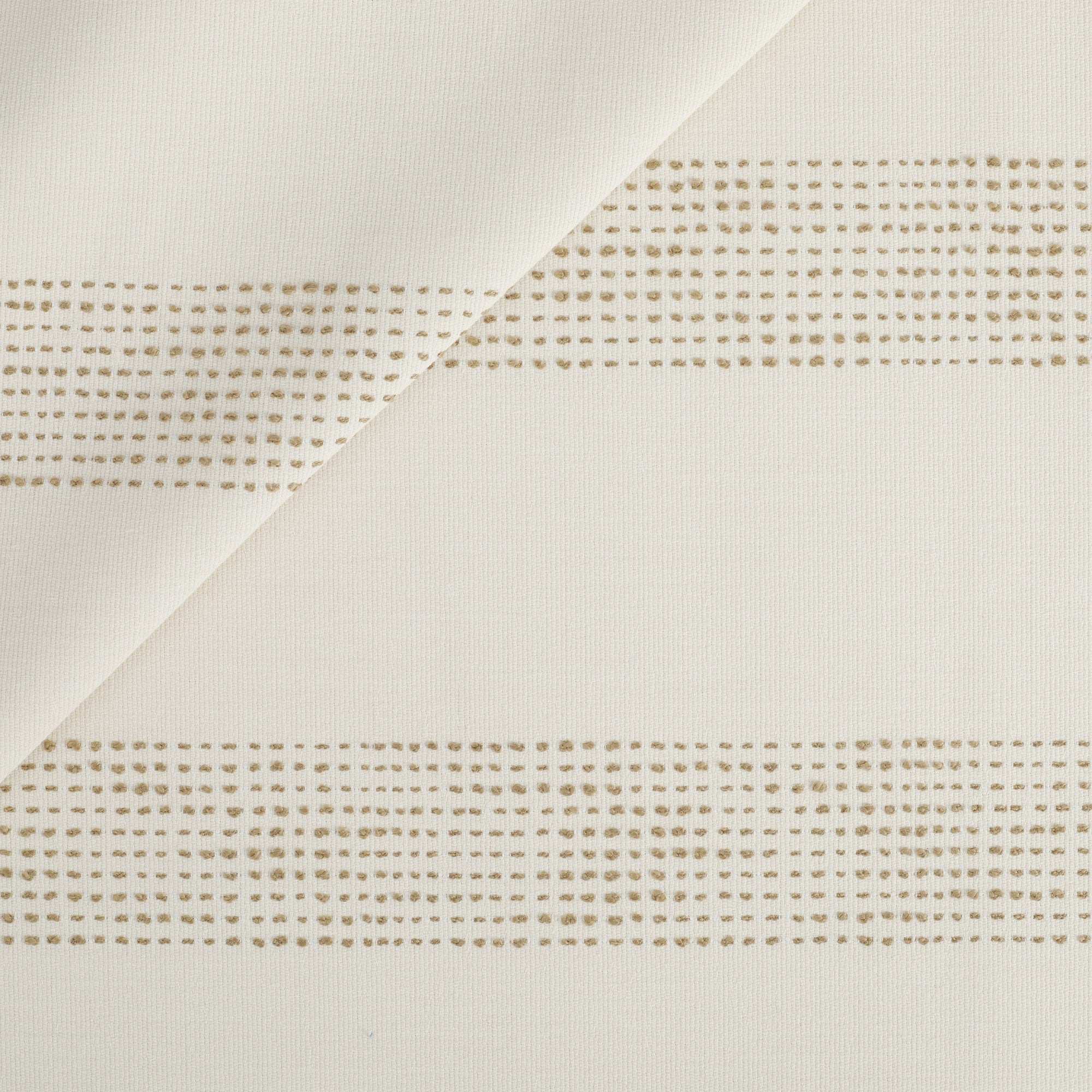 This cream and tan indoor/outdoor upholstery fabric features embroidered dotted stripes with raised stitched detailing. The banded stripes add soft texture and a relaxed coastal feel.