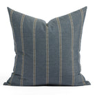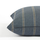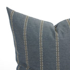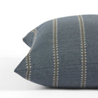 This dark blue indoor/outdoor pillow features a fine embroidered stripe with raised stitch detailing and geometric interest. The global-inspired motif brings subtle dimension and a tailored finish that is both refined and eclectic.