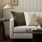This moss green and oatmeal striped pillow showcases a simple ticking stripe with subtle vintage charm. It’s an easy-to-pair piece with a timeless and versatile look.