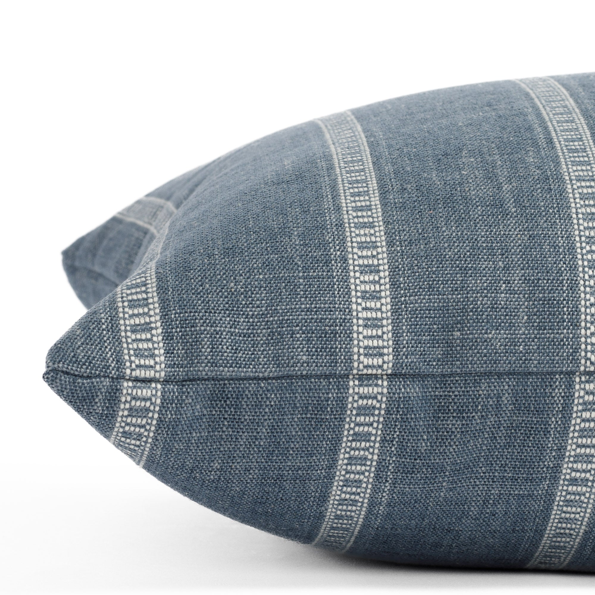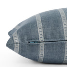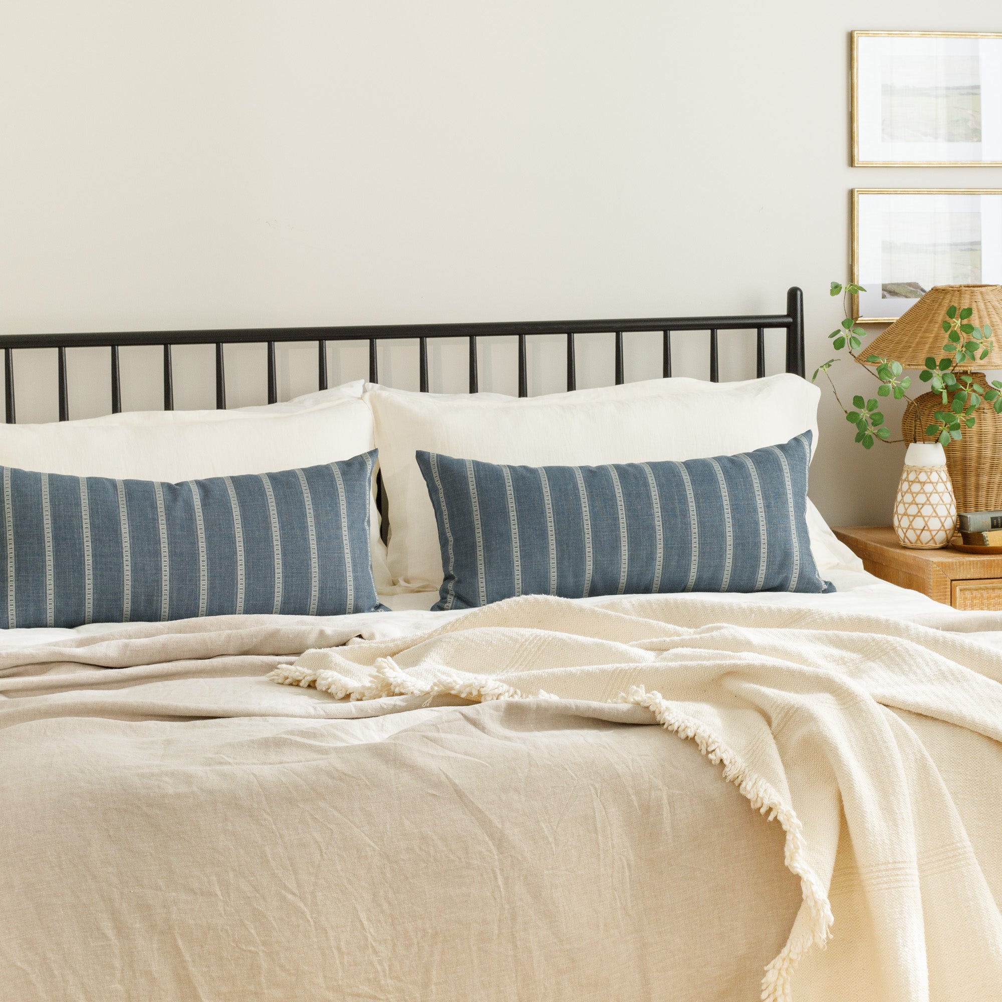 This chambray blue striped pillow blends an eclectic look with timeless versatility.