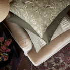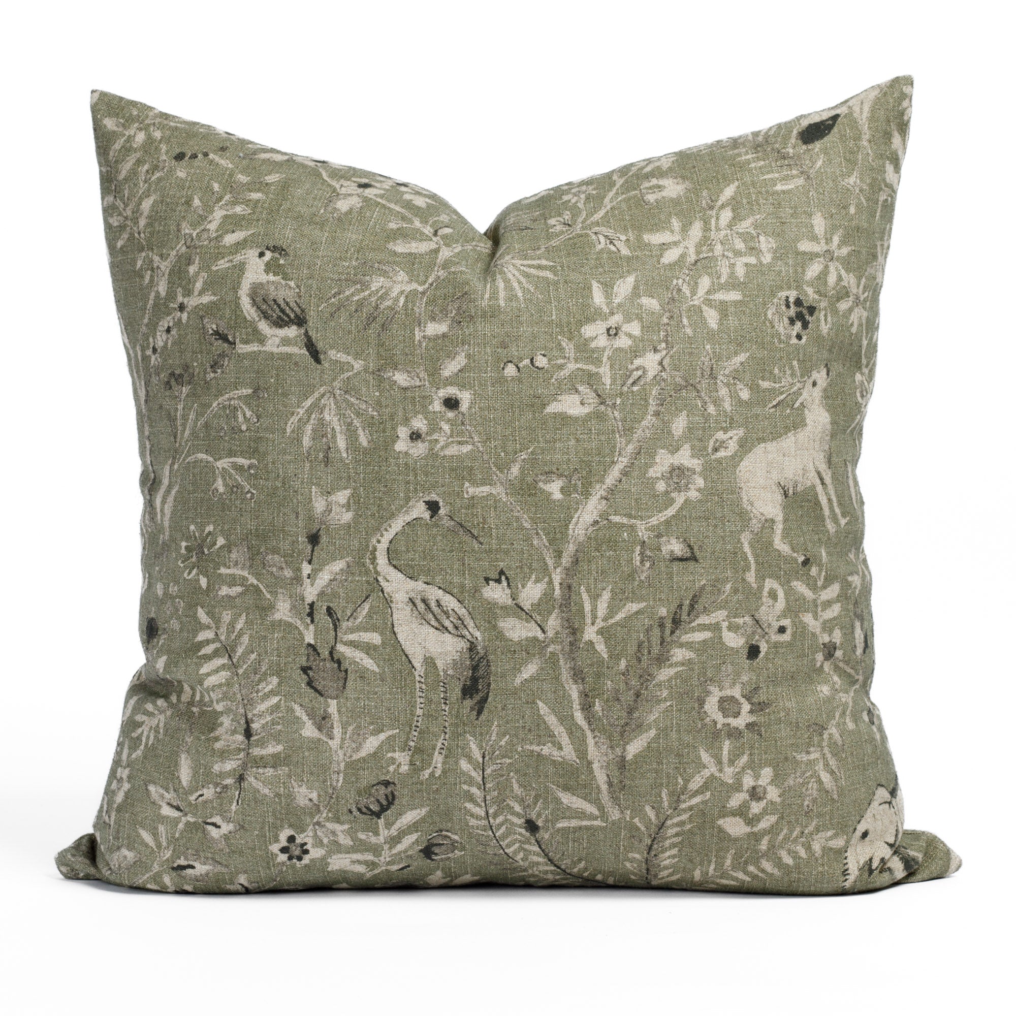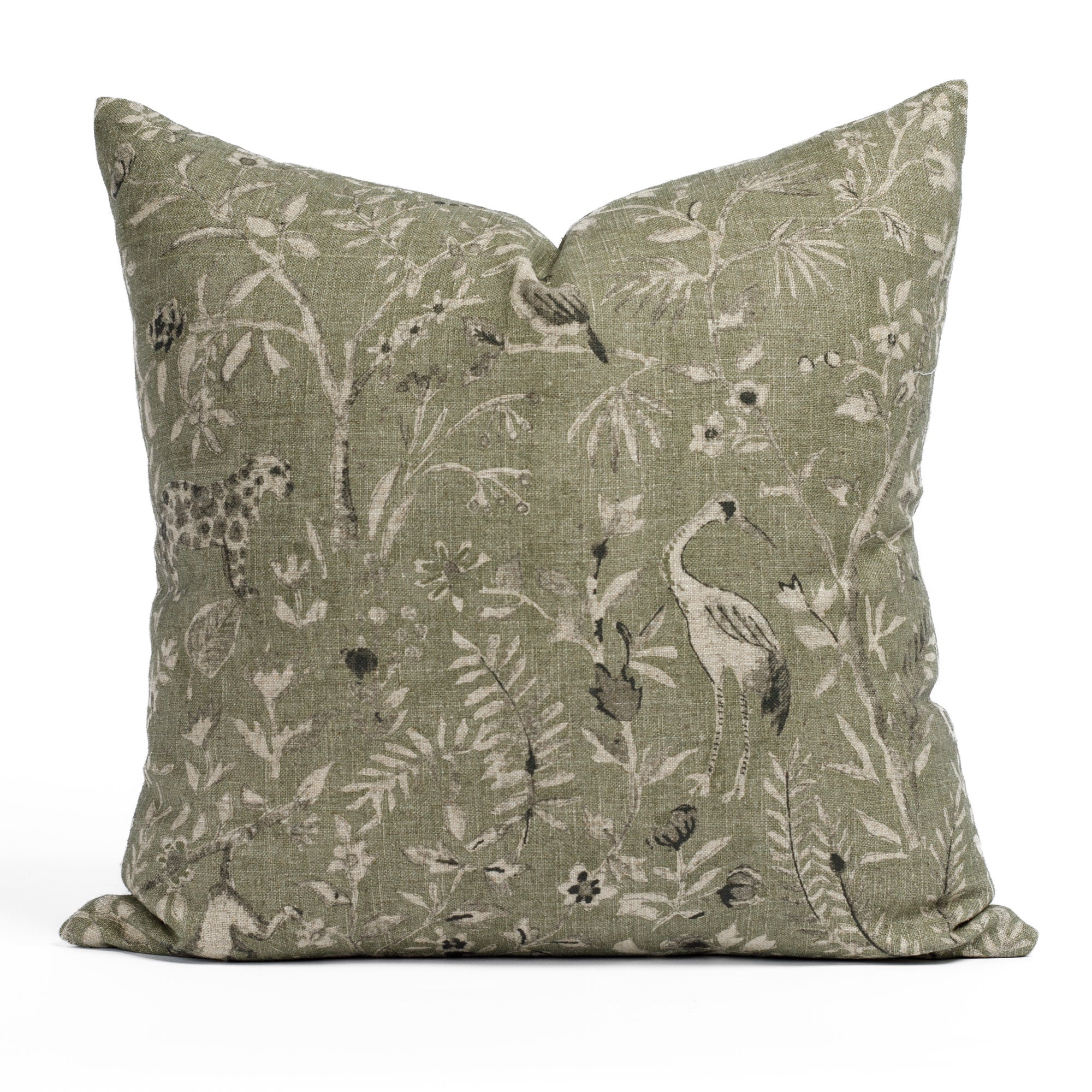 Add this mossy green pillow to your mix for an instant dose of exotic sophistication. Featuring an enchanting flora and fauna botanical pattern, the slubby texture of the linen and hand-drawn, vintage quality of the print creates a timeworn appeal that is organic, historic and elegant. Layer this earthy piece into any space for an elevated spring/summer look.
