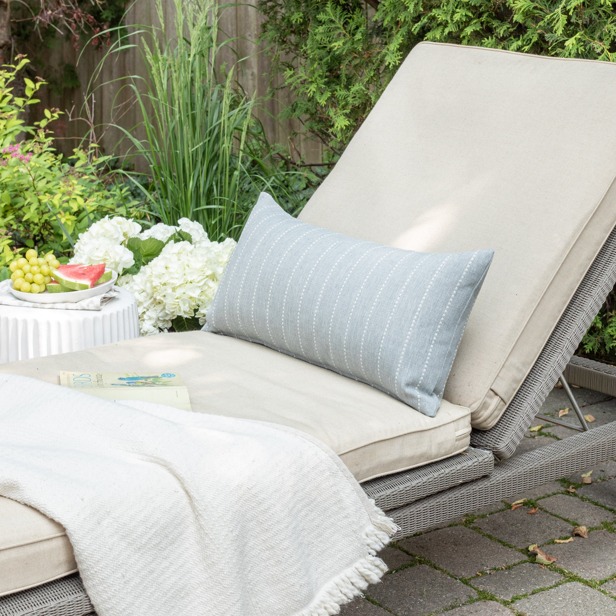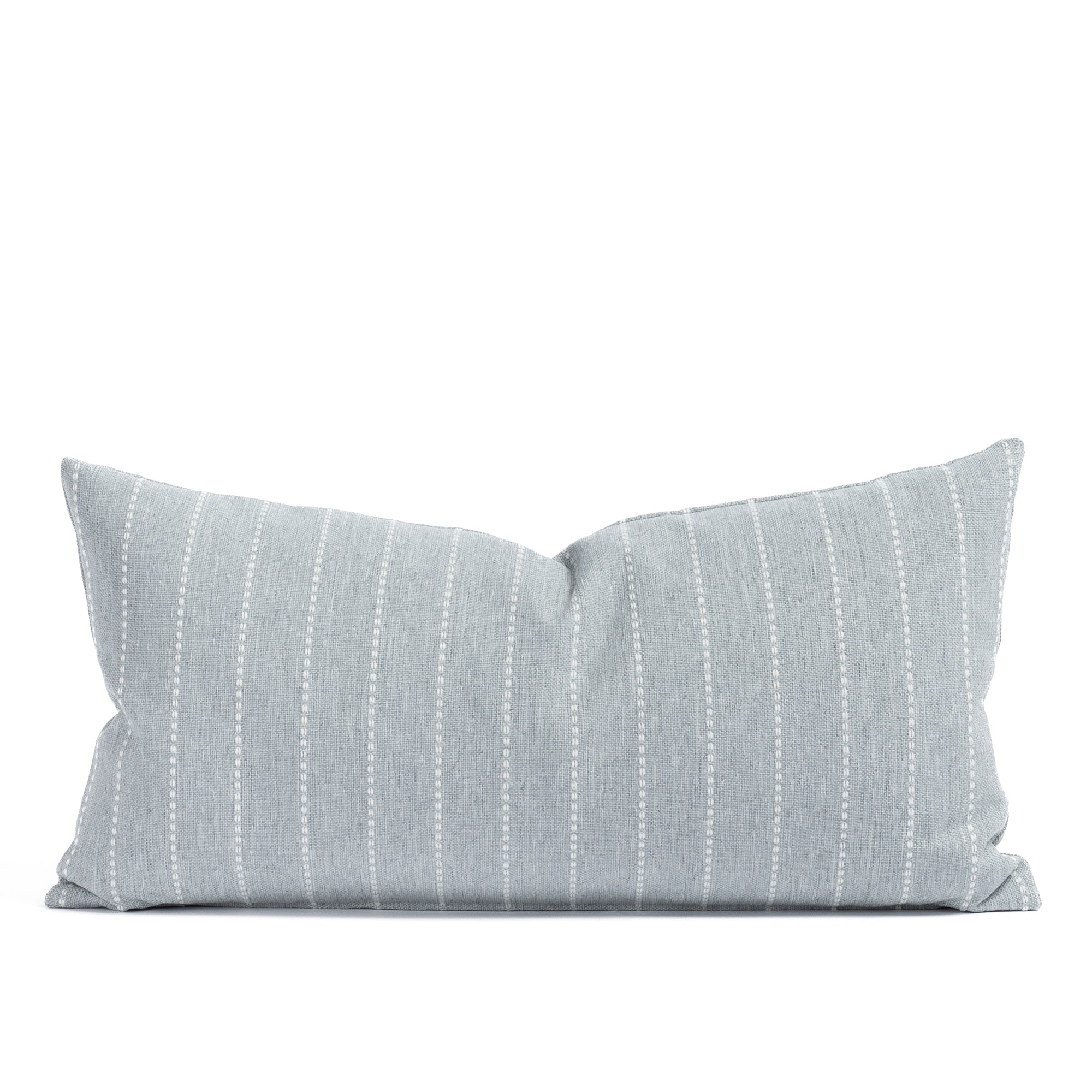 This indoor/outdoor, striped lumbar pillow in pale blue-grey and white is a timeless classic. With a finely woven texture and crisp running stitch, it will add an essential pop of pattern to your patio, porch or deck, or bring it indoors to seamlessly mix with any pillow-scape.