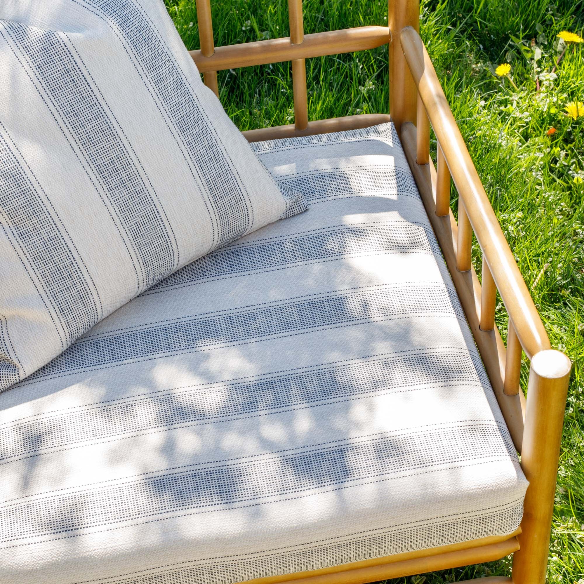 - Pattern: wide-set vertical stripes featuring delicate, woven running stitches