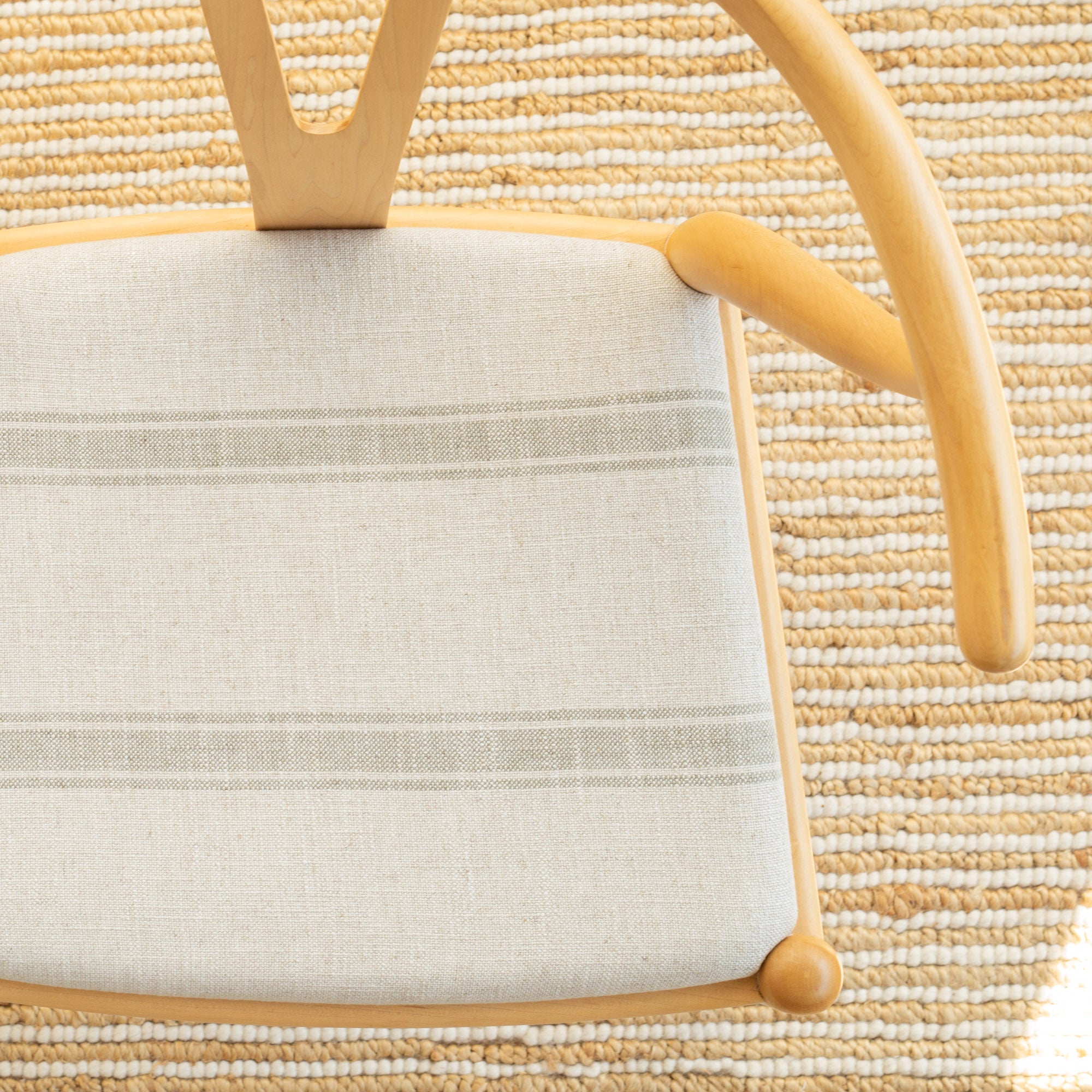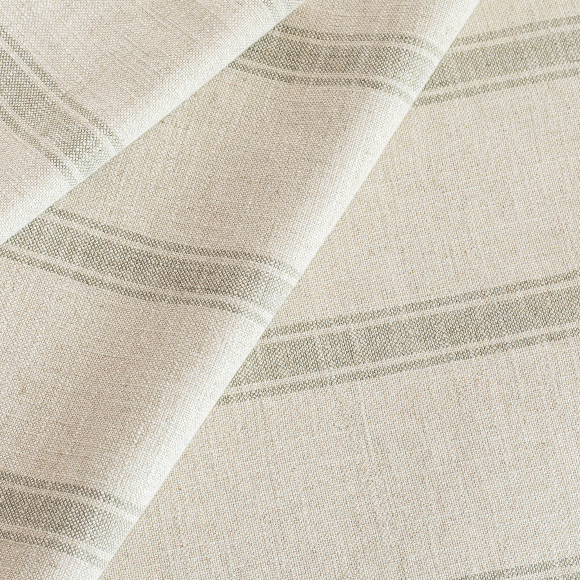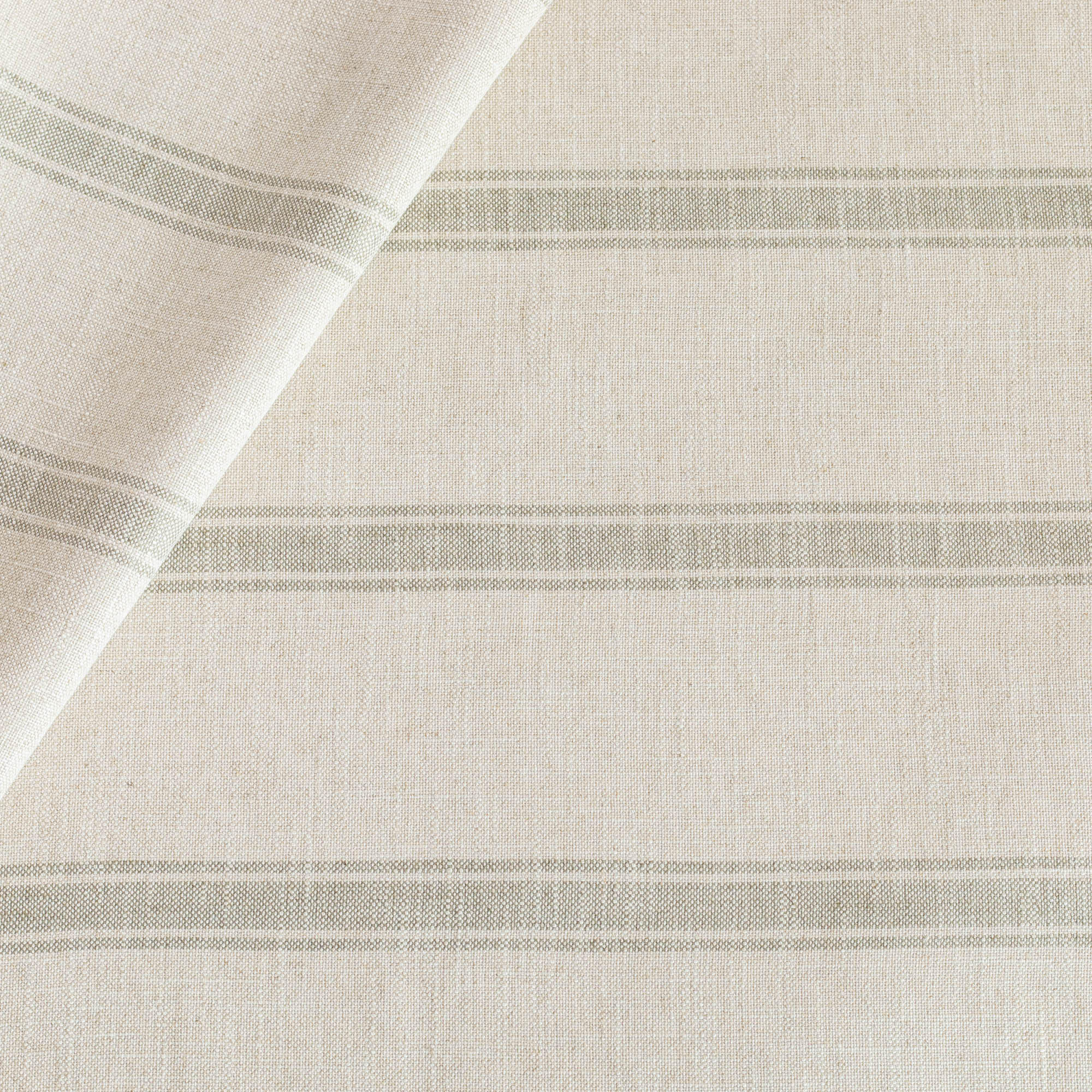 This multipurpose linen blend upholstery fabric features a horizontal wide-set ticking stripe in a classic colour combination of earthy oatmeal and watery blue with a soothing green undertone. Reminiscent of a vintage French grain sack, the casual appeal is elevated by a luxurious hand feel and weighty texture, which creates a style that is both laidback and sophisticated.